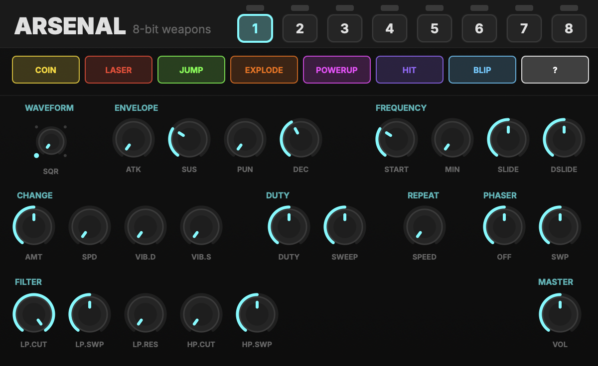 An eight source 8-bit retro percussion machine based on DrPetter's sfxr sound generator. C-3 through C-4 trigger the sounds and each can be set with a generated patch of a specific type "coin" or "laser" etc. Or click the ? type to fully randomize that sound unit. Play with repeats, duty cycles, and a phaser to really make some wild sounds.