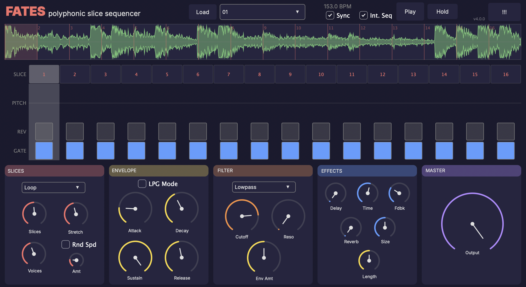Polyphonic sample slicer and beat mangler. Load any audio file or choose from 9 built-in drum loops, then slice, sequence, and reshape it into something new. Features a variable-step sequencer with per-step pitch, gate, and reverse controls, plus an ADSR envelope with optional LPG mode for that West Coast pluck. Add movement with the multi-mode filter, stereo panning, and built-in delay/reverb. Great for chopped breaks, glitchy textures, and rhythmic sample destruction.