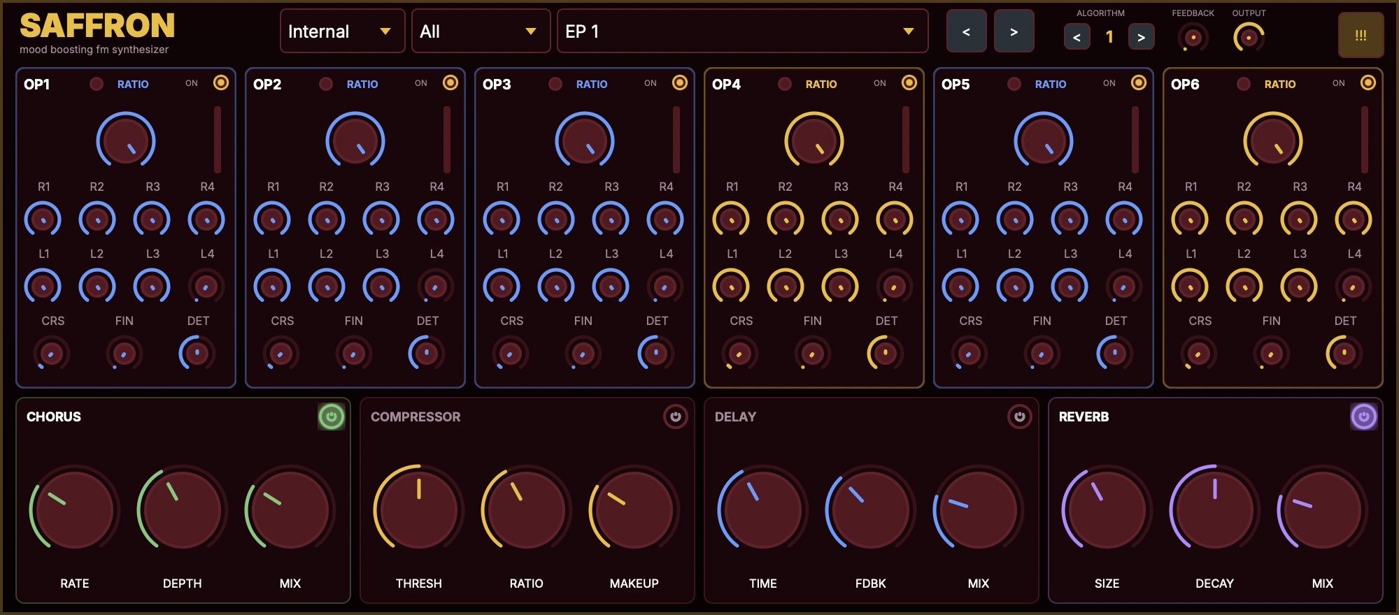 A 6-operator FM Synthesizer with effect chain. Fully DX-7 compatible, so you can load any DX-7 sysex files in as sound banks. Full edit controls over all 6 operators, and a serial effects chain of stereo chorus, a light compressor, tape delay, and simple reverb all add up to warm up the chilly FM timbres.